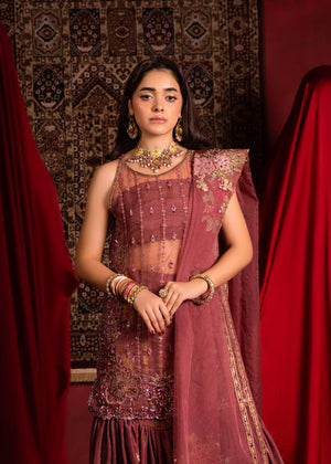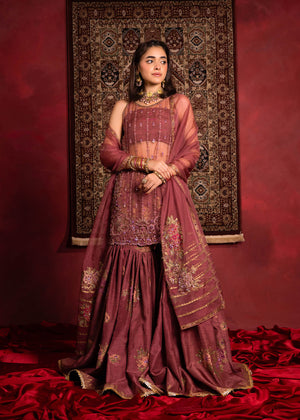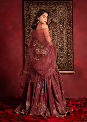 The opera mauve colour attire shirt is in organza based on embridery and thread work adorned with heavy ada work on it paired with korean rawsilk gharara with block printed patterns with embellishments with orgenza dupatta embellished with block print patterns and ada work.
